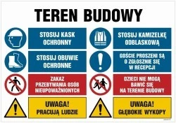 ZNAK - OI023 Teren budowy, Stosuj kask ochronny, Zakaz przebywania osób nieupoważnionych, Stosuj obuwie ochronne, 100 x 75 cm PN