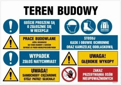 ZNAK - OI023 Teren budowy, Stosuj kask ochronny, Zakaz przebywania osób nieupoważnionych, Stosuj obuwie ochronne, 100 x 75 cm FN