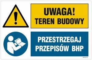ZNAK ‑ OI043 Uwaga! teren budowy, Przestrzegaj przepisów BHP 70 x 46,7 cm ON ‑ Blacha ocynk