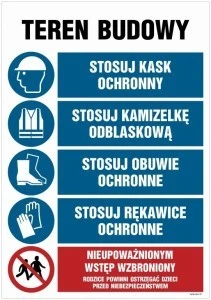 ZNAK - OI023 Teren budowy, Stosuj kask ochronny, Zakaz przebywania osób nieupoważnionych, Stosuj obuwie ochronne, 100 x 75 cm PN
